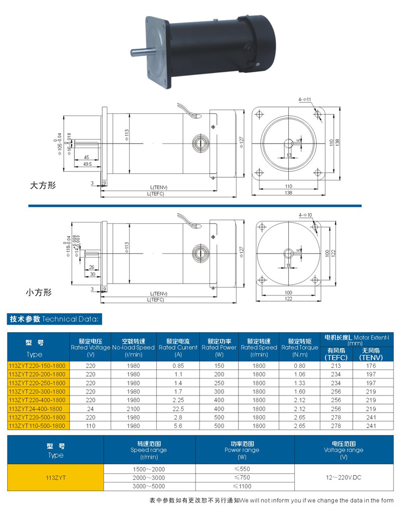 ZYT系列永磁直流电机具有效率高,调速方便,价格低等优点。广泛用于电线,电缆,轻工,纺织,造纸,化工,印染,冶金,橡胶,拉丝,挤出机械,医疗器械,食品加工,印刷包装等各种行业。配上调速器可以实现恒转矩无级调速。
